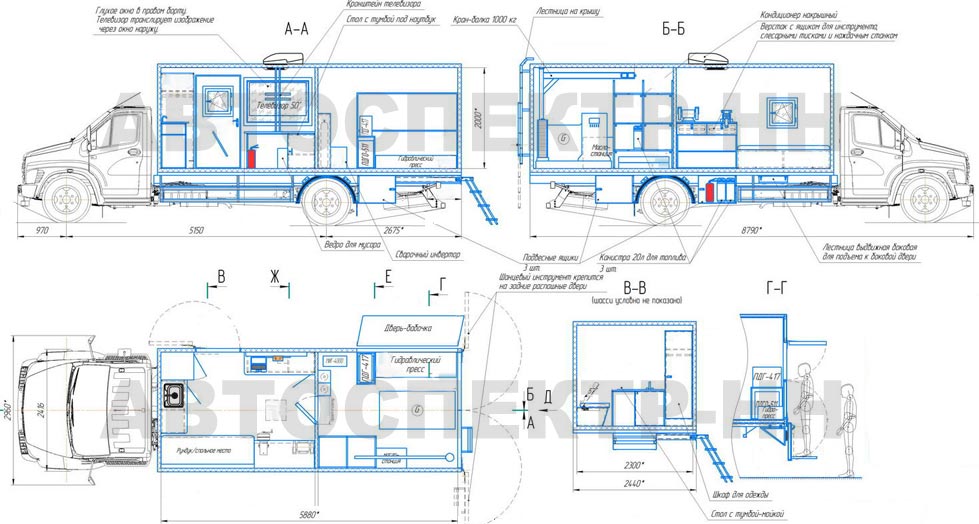 • Телевизор диагональю 50-55", крепится изнутри на стене по правому борту. Имеет возможность крепления снаружи фургона на правый борт.