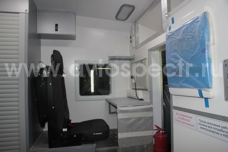 Кабина водителя дополнительно утеплена с целью эксплуатации в районах Крайнего Севера и Арктики, в ней выполнена шумоизоляция. В дверях кабины водителя выполнена вертикальная система опускания/подъема стекол, с возможностью их фиксации по высоте в любом промежуточном положении. На пассажирском месте в кабине водителя установлено сиденьес креплением для дыхательного аппарата газоспасателя. (в конструкции сидения предусмотрена возможность регулировки вперед-назад. Обивка сидения выполнена изизносостойкой ткани, исключающей потерю несущей способности в течении гарантийного срока автомобиля. Конструкция сиденья обеспечивает возможность одевания дыхательного аппарата и его расфиксирование в сидячем положении, а также предотвращает повреждение дыхательного аппарата. Сиденье оборудовано ремнем безопасности. В зоне правого крайнего сиденья в кабине водителя размещен дополнительный светодиодный светильник местного освещения, не ослепляющий водителя.