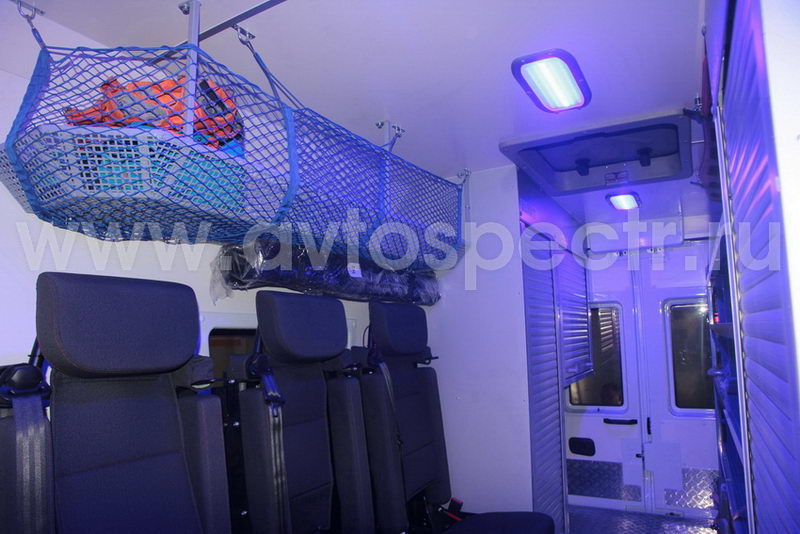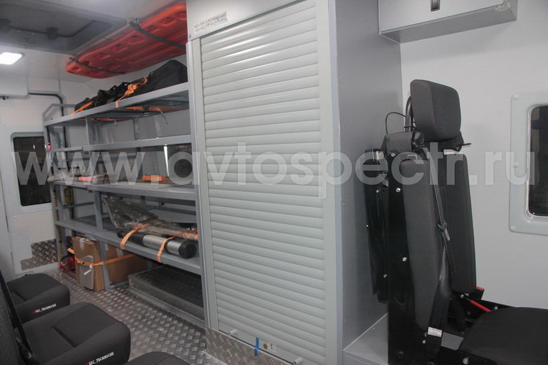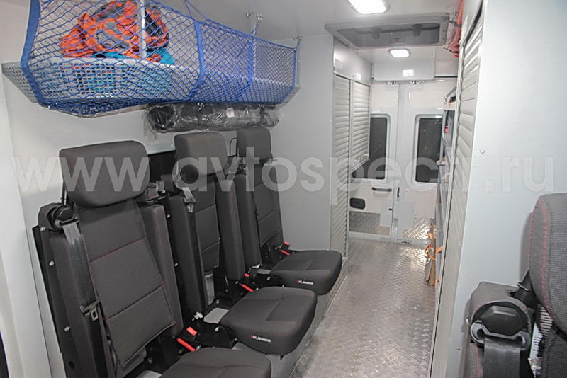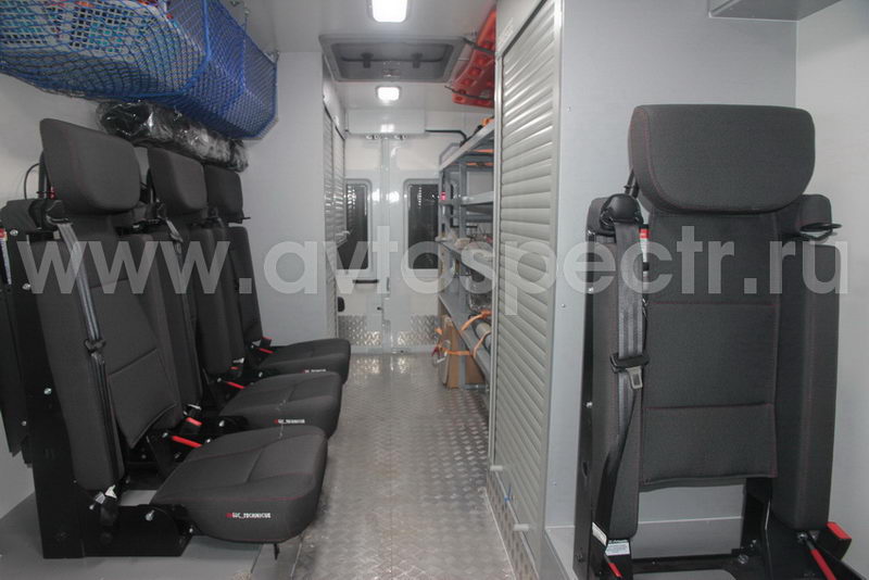 Для размещения 4 (четырех) человек в кузове установлены индивидуальные сиденьяс возможностью размещения дыхательного аппарата на сжатом воздухе в спинках сидений (каждое сидение имеет отдельный механизм фиксации дыхательного аппарата). Обивка сидения выполнена изизносостойкой ткани, исключающей потерю несущей способности в течение гарантийного срока автомобиля. Конструкция сидений обеспечивает возможность одевания дыхательного аппарата и его расфиксирование в сидячем положении, а также предотвращает повреждение дыхательного аппарата. Сиденья выполнены в виде рундука и оборудованы ремнями безопасности.