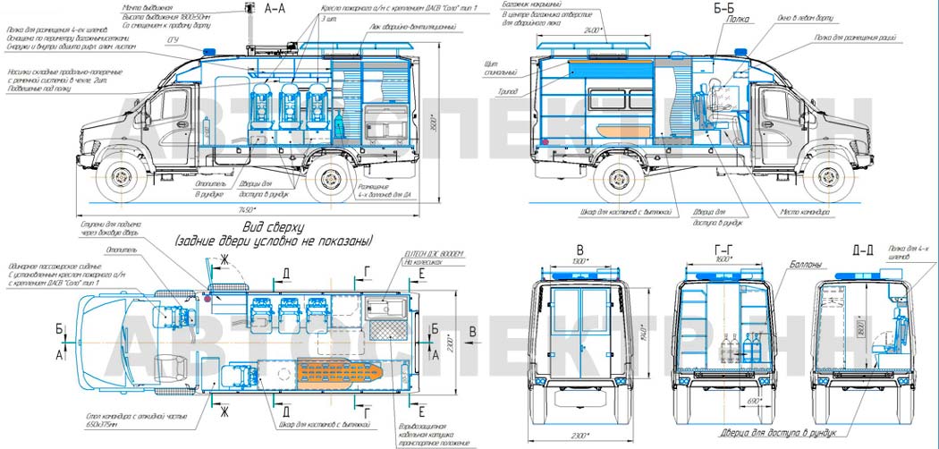 Размеры служебного и оперативного отсеков позволяют газоспасателям легко перемещается внутри в полный рост (до 180см), обеспечивают возможность экипировки газоспасателей в средства защиты в пути следования к месту аварии, оказания первой помощи пострадавшим.