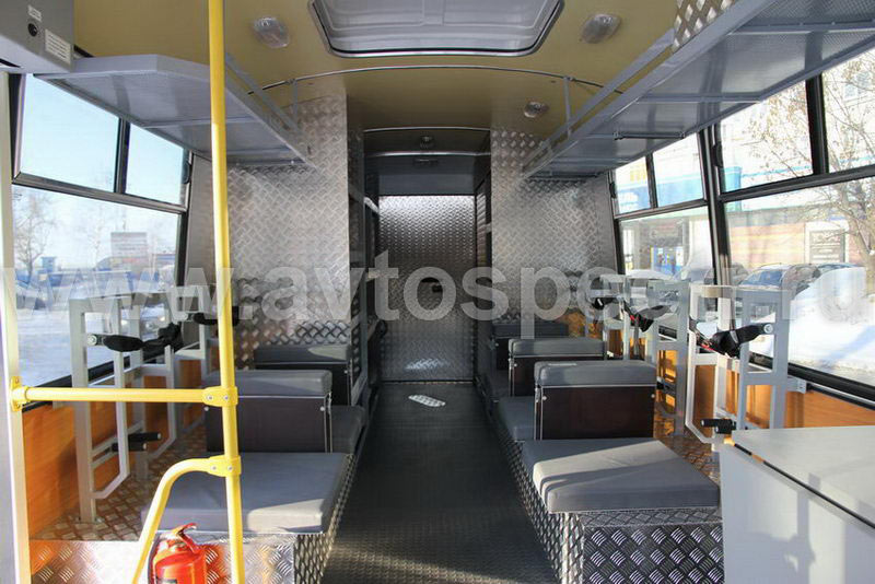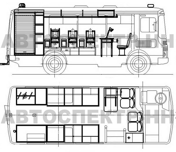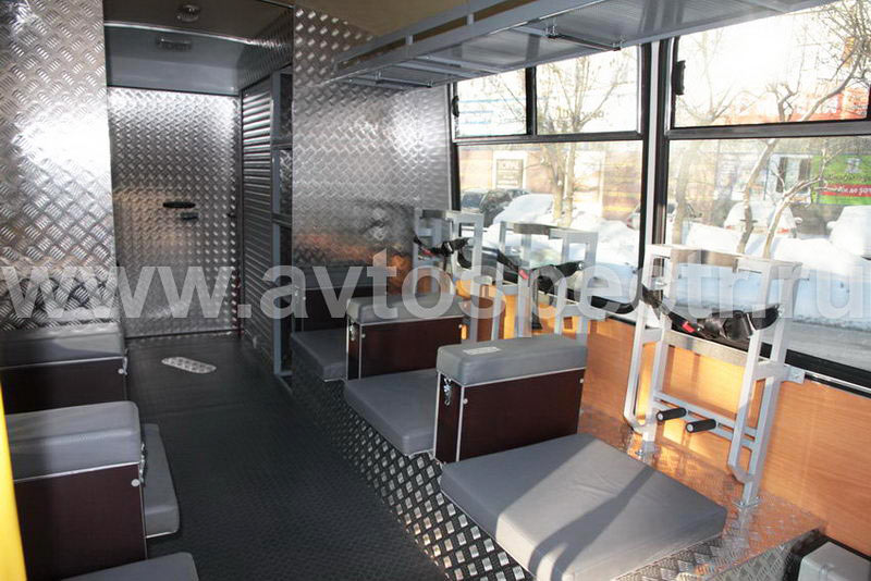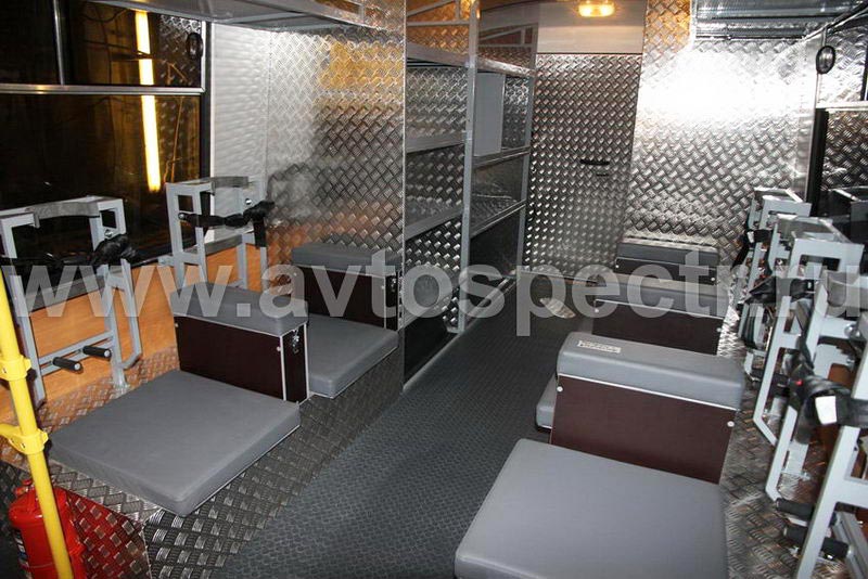 • Стеллажи для размещения оборудования – слева и справа, в задней части салона с обеспечением прохода.