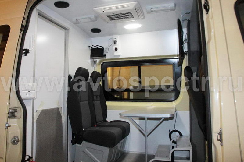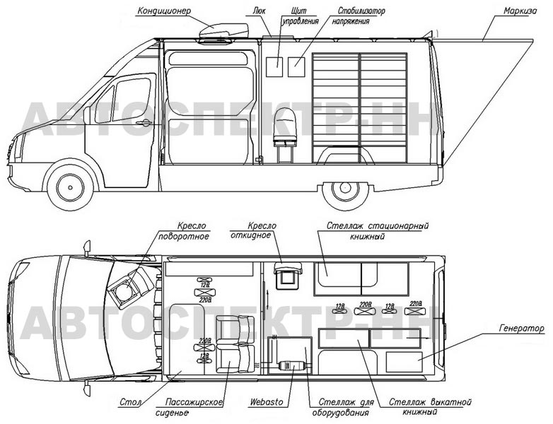 • Автономная система освещения с питанием постоянного тока от бортовой сети автомобиля 12/220 В. Плафоны в грузовом и пассажирском отсеках.
