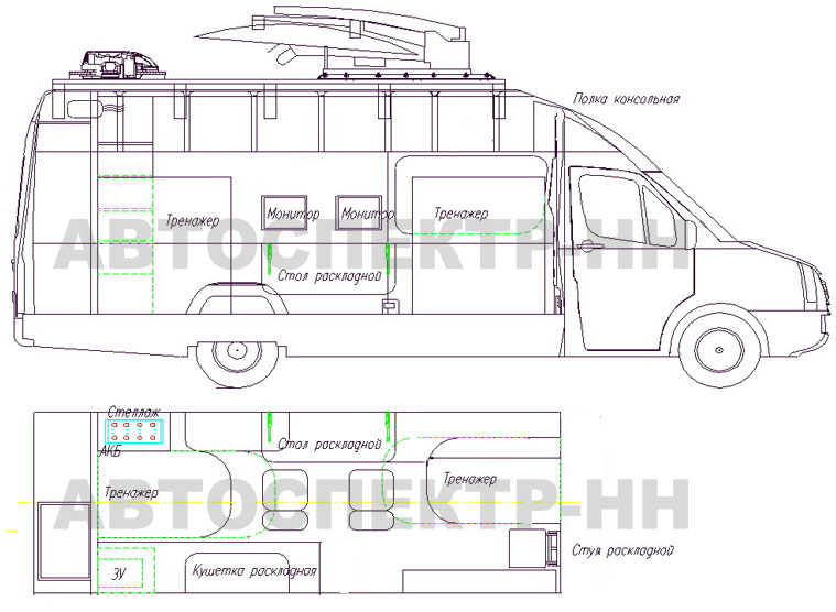 • Автономный отопитель 12 В, дизель в кабине водителя с выводом в лабораторный отсек. Питание от дополнительной АКБ.