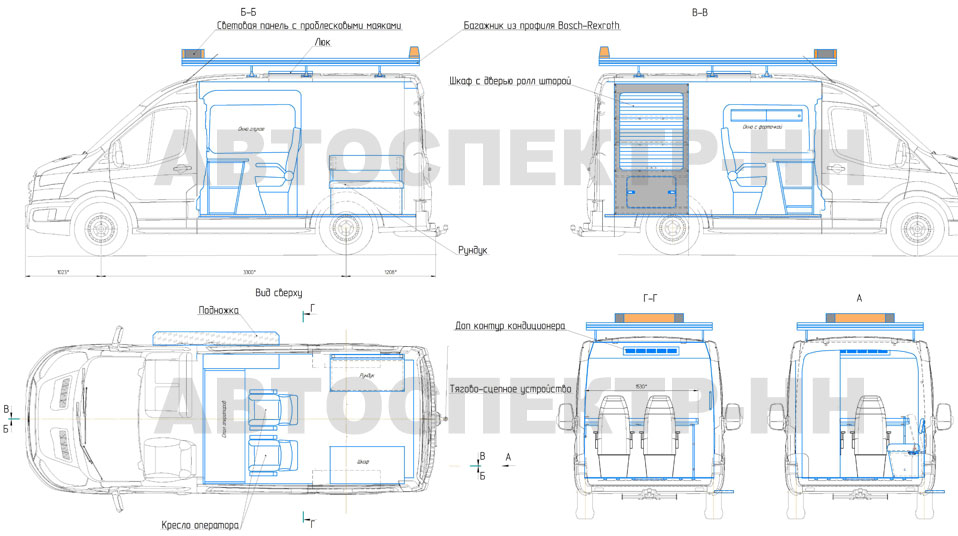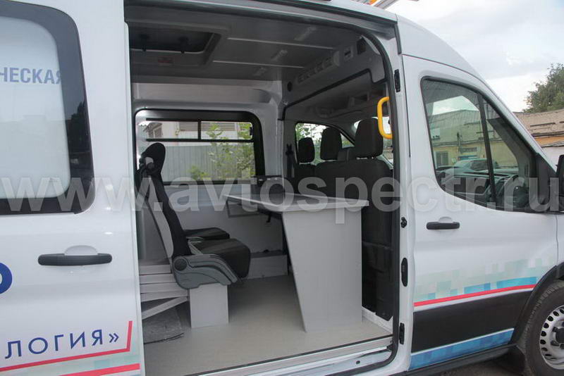 Автомобиль специальный «Передвижная лаборатория» АВТОСПЕКТР Mobilab мод. 3032А2 на шасси Ford Transit предназначен для организации диагностики автомобильных дорог, доставки экипажа и оборудования до места дислокации.