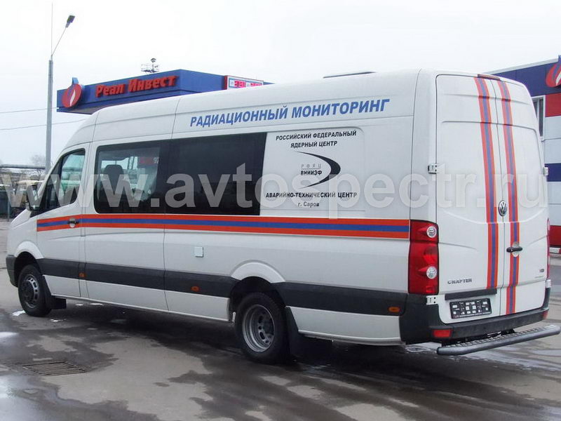 Мобильная лаборатория радиационного мониторинга изготовленная на базе автомобиля Volkswagen Crafter обеспечивает комфортные условия работы бригады лаборантов за счет автономных систем энергоснабжения, отопления и кондиционирования. Измерительное оборудование позволяет осуществлять мониторинг радиационной обстановки, проводить необходимые замеры объектов, почвы и воды, обрабатывать и передавать полученные данные. Номенклатура установленного оборудования и компоновочная схема отсеков может меняться в зависимости от выполняемых задач и количества экипажа.