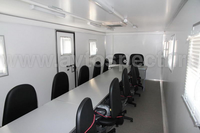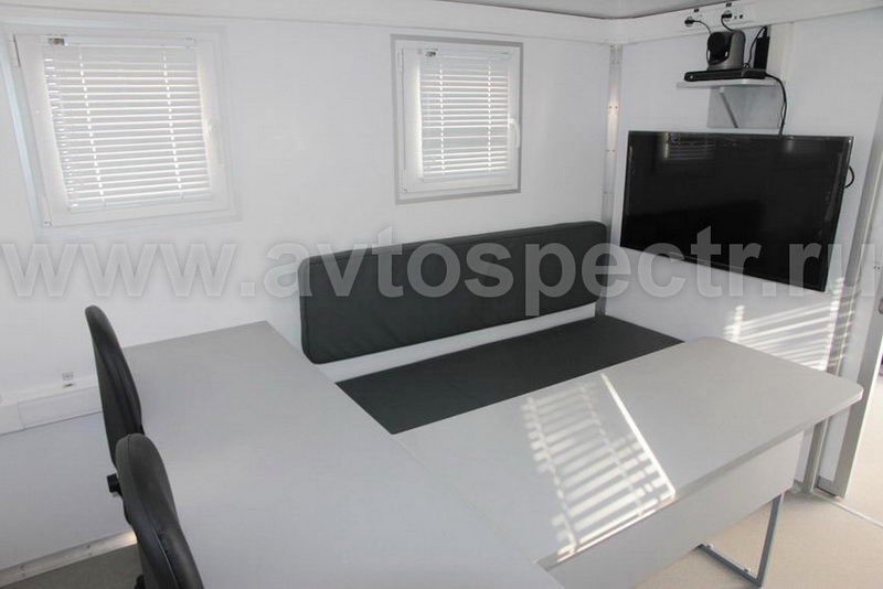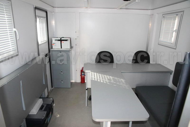• Вдоль перегородки с грузовым отсеком, начиная от левой панели кузов–фургона,  установлен стол на два рабочих места с тремя выдвижными ящиками для документов, расположенными горизонтально под панелью стола.