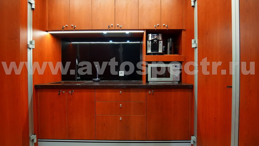 - по левому борту кухонный блок состоящий из: тумбы со встроенным в нее холодильником, кулером для воды, кофеваркой, столешницей с раковиной, секции подвесных шкафчиков с двумя микроволновыми печами. Уровень освещенности в кузове-фургоне, не менее 5 лк;