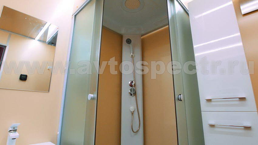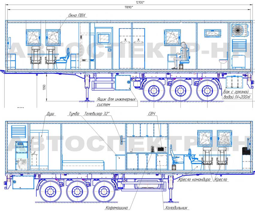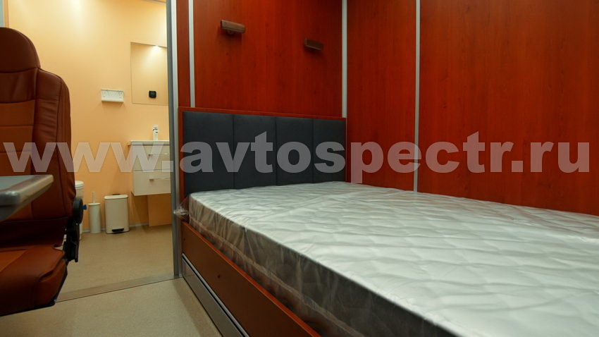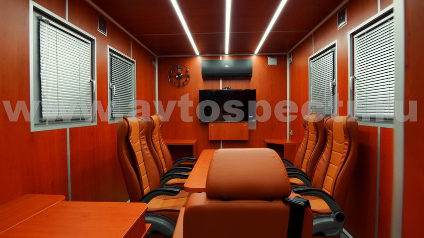 - Установлены три перегородки со сдвижными дверями, разделяющие салон на отсеки (водительский, операторский, санитарно-бытовой, переговорный)