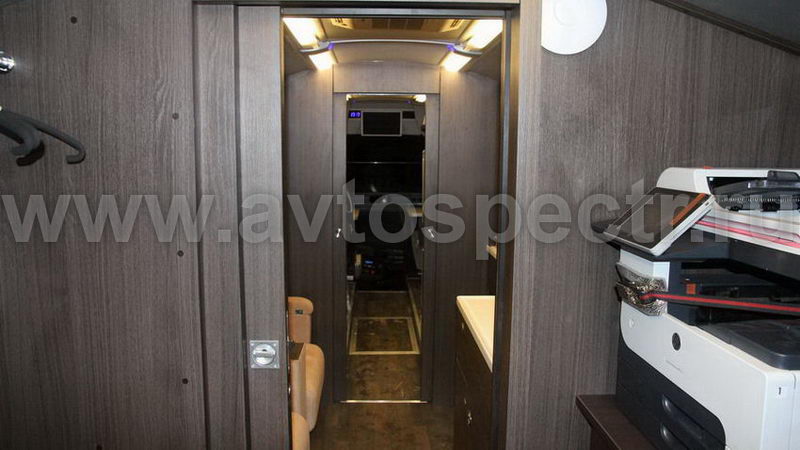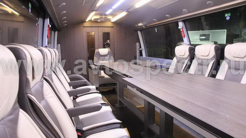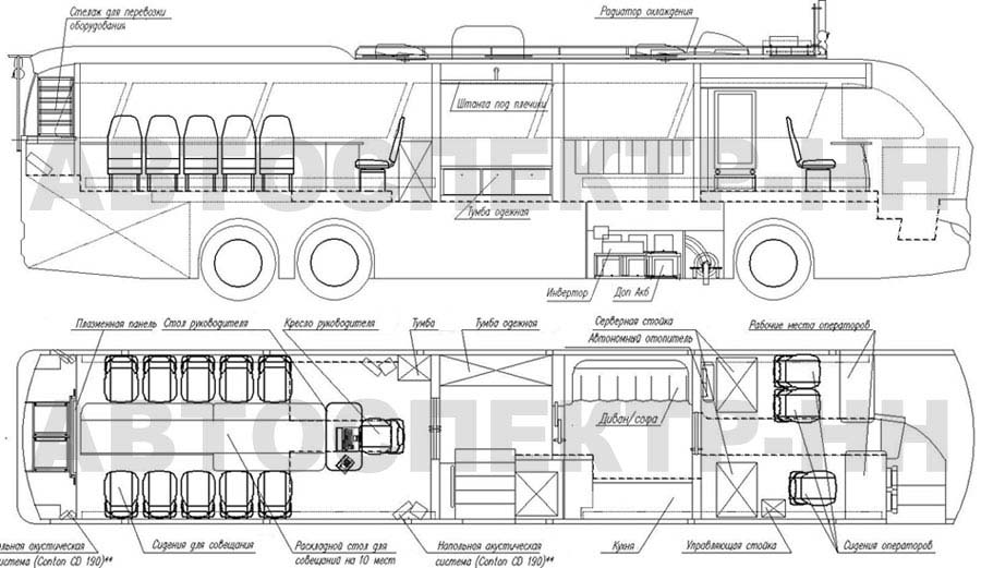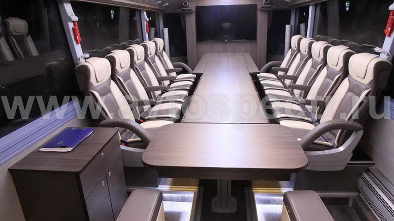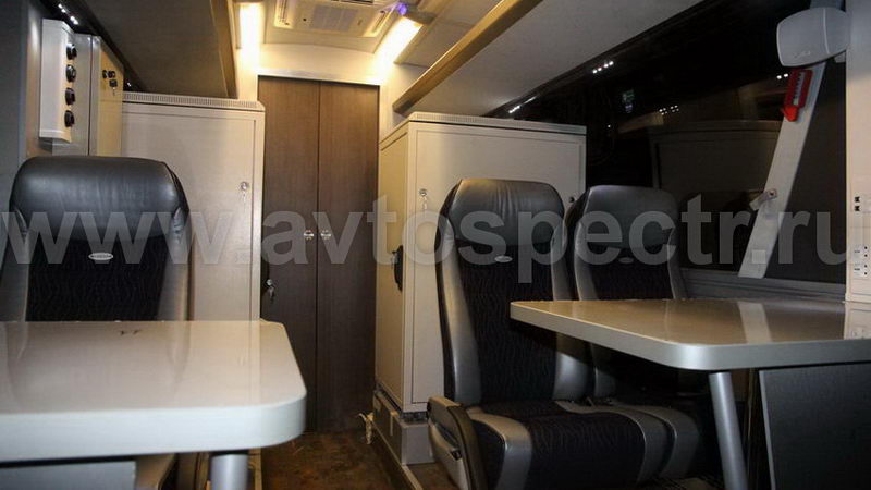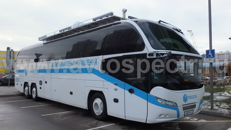 Подвижный пункт управления (ППУ) на базе автобуса NEOPLAN позволяет в полной мере обеспечить реализацию функций Подвижного пункта управления руководителя / Губернатора субъекта РФ. Внутри, специально оборудованного кузова автобуса, проложены коммуникации внутренней и внешней связи, энергообеспечения рабочих мест и периферийной аппаратуры. В ППУ расположен отсек для проведения совещаний, бытовой и рабочий отсек, туалетная комната. Мобильный пункт управления оснащен мощной автономной генераторной установкой, системами климатики и вентиляции. Кроме того предусмотрена дублирующая система энергоснабжения от дополнительного генератора работающего от двигателя. Специальный автобус разрабатывается под конкретные условия эксплуатации, готовится полный комплект конструкторской и разрешительной документации, проводятся все необходимые согласования и испытания комплекса.