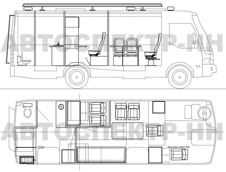 Автомобиль штабной (АШ) на базе автобуса ПАЗ предназначен для организации работы оперативного штаба на местах ЧС (техногенных катастроф и стихийных бедствиях). Штабной автобус позволяет обеспечить работу и взаимодействие оперативных групп организацию связи и отдыха сотрудников, задействованных в ликвидации ЧС.