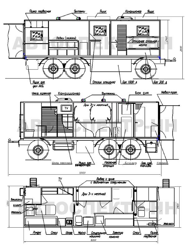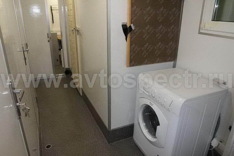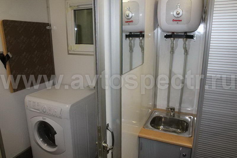 • На крыше герметично закрывающиеся ящики для размещения оборудования (сливные и заливные шланги, помпа, топор, лопата, мягкие баки для сбора грязной воды, заземление фургона).