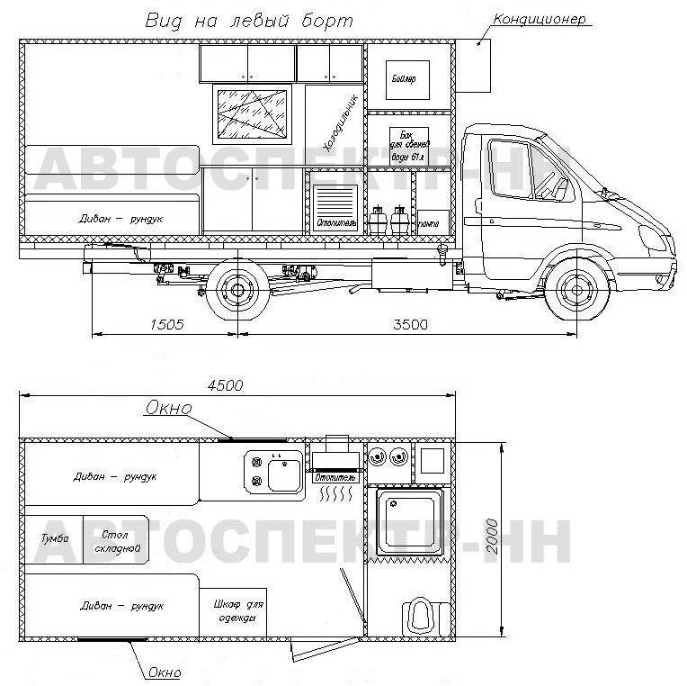 В автодоме можно с комфортом разместить мебель для отдыха и хранения вещей, бытовые приборы, систему отопления и вентиляции. Дом на колесах Газель подходит для путешествий и длительных поездок в любое время года.