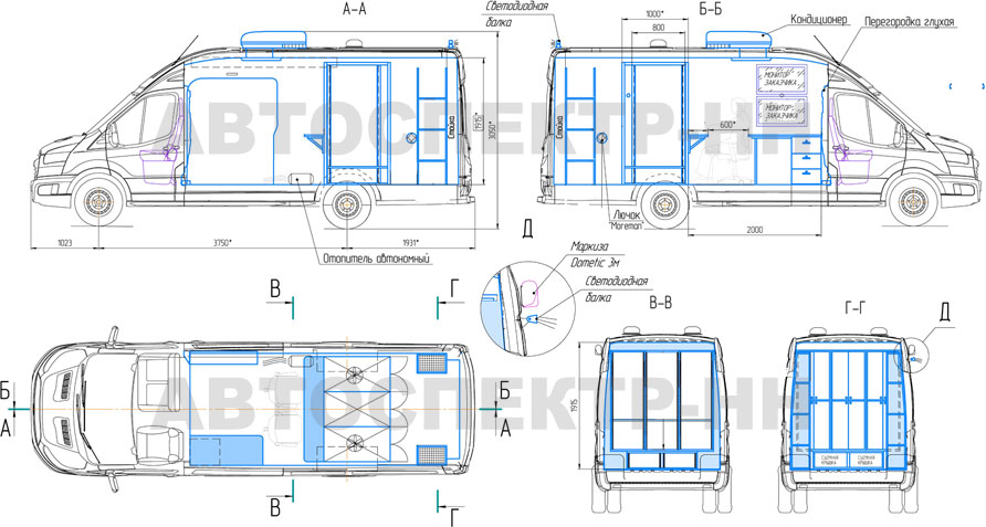 - Сидения техперсонала (вращающиеся офисные кресла или раскладные сидения, уточняется на момент проектирования) с креплением в транспортном положении.