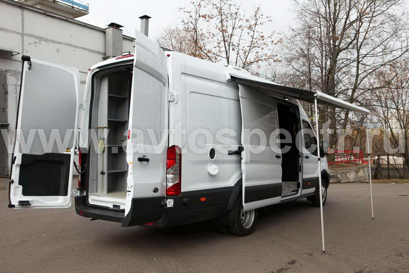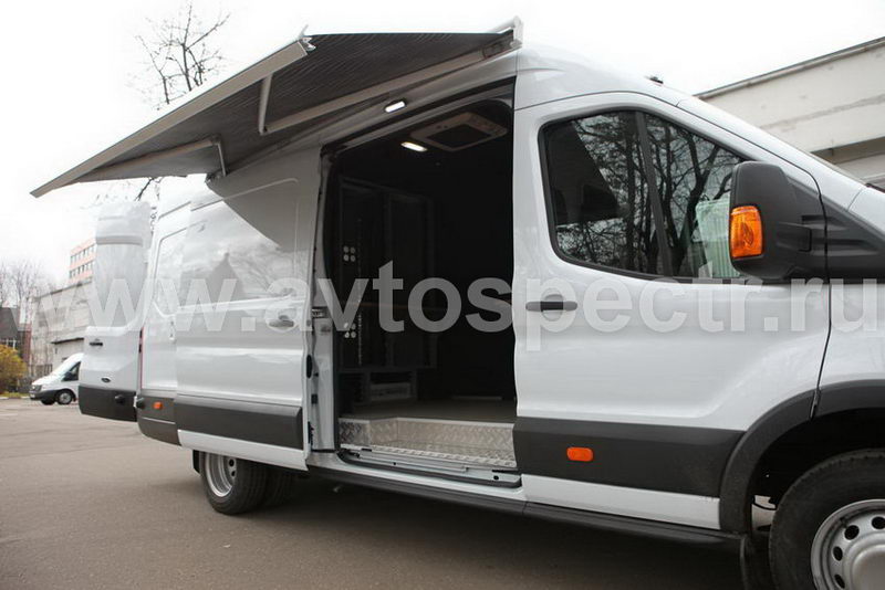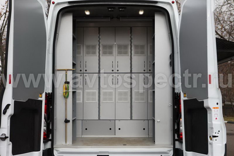 - В грузовом отсеке расположен технологический доступ к задней панели 19 дюйм. стоек, стеллаж с полками, регулируемыми по высоте, люки ввода кабелей по левому и правому борту.