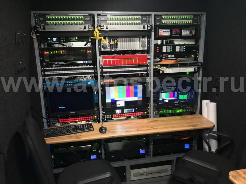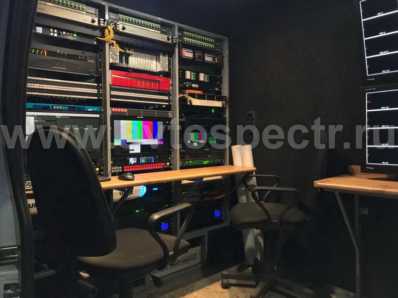 - В инженерном отсеке расположены 3 стойки 33RU глубиной 1000 мм, 2 отсека по 5RU глубиной 1000 мм со столешницей, стол с тумбой вдоль левого борта, сидения тех. персонала, усиление над столом для мониторов.