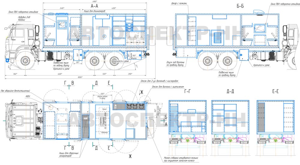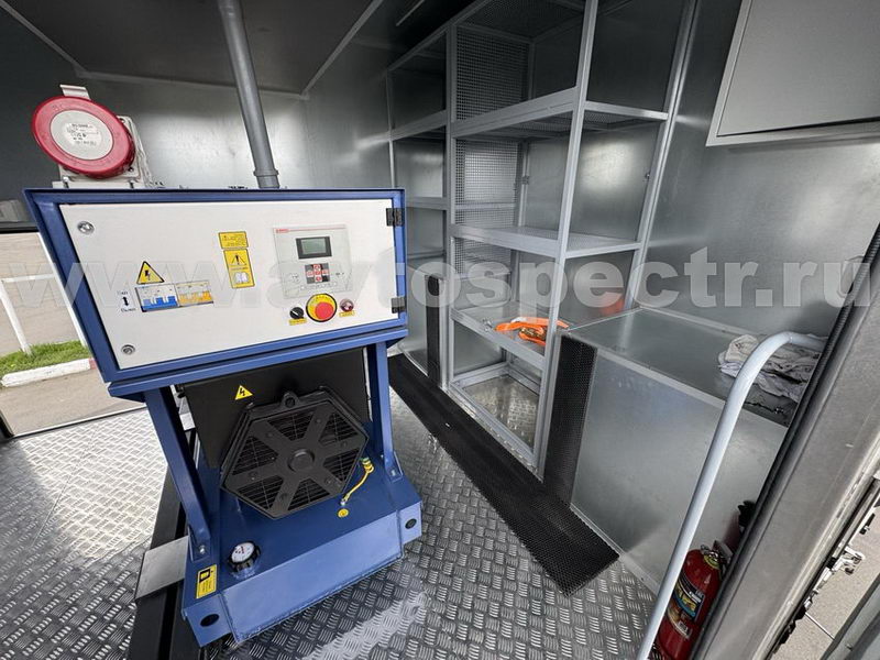 • На шасси автомобиля «Аварийная мастерская» Автоспектр Mobilab устанавливается изотермический фургон – специальная автомобильная надстройка с отсеками для перевозки людей и оборудования. Состоит из основания, передней и боковых панелей, крыши (с люком), перегородки и заднего портала. Наполнитель стенок – ЭППС 50мм, внешняя обшивка – оцинкованный лист.