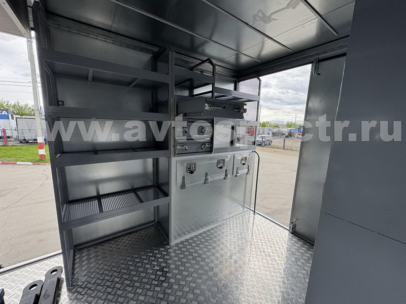 • Необходимо обеспечить свободный доступ к оборудованию, агрегатам, инструменту и средствам охраны труда. На задней части фургона двухстворчатая дверь высотой 1800 и шириной 1000 мм, с поручнем внутри с возможностью открывания изнутри и выдвижной лестницей.